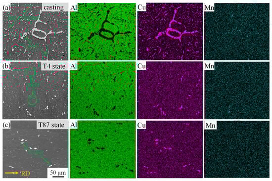 Figure 4 presents the SEM micrograph of the feedstock and the corresponding elemental mappings. In the casting process of AA2219, composition segregation occurs, and large agglomerated particles (CSPPs) and needle-like precipitates Al7Cu2(Fe, Mn) can be observed in Figure 4a [33]. CSPPs were also observed in AA2219-T4 and AA2219-T87 (Figure 4b,c). However, after a long-time homogenization treatment, composition segregation disappeared and the CSPP size decreased significantly. The surface scan results of elemental mappings support this consequence.