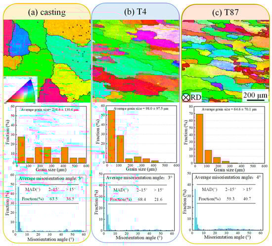 EBSD results of feedstock under different conditions. (a) Casting, (b) T4 state, and (c) T87 state.