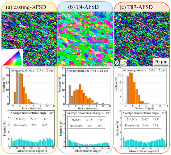 EBSD results of feedstock after AFSD. (a) Casting-AFSD, (b) T4-AFSD, and (c) T87-AFSD.