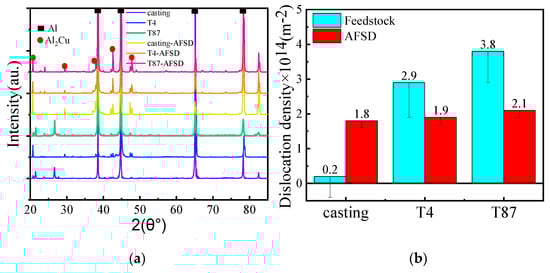 The XRD patterns for different specimens (before and after the AFSD process) were shown in Figure 9a. The dislocation density can be evaluated using the following equation, based on the XRD patterns [34]:
