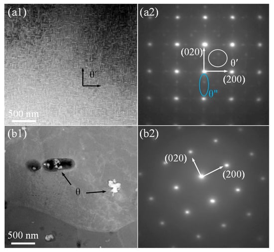 STEM images and corresponding SAED pattern of AA2219 alloy: (a1,a2) T87 and (b1,b2) T87-AFSD.