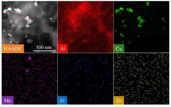 Figure 11 shows HAADF-STEM images and corresponding EDS mappings of T87-AFSD. Some disc-shaped precipitates were observed in HAADF-STEM images, Through EDS mapping, it was found that the Cu element was segregated, and other elements (Mn, Zr, Zn) were evenly distributed in the aluminum matrix, which further confirmed that the disc-shaped precipitation was equilibrium θ phase.