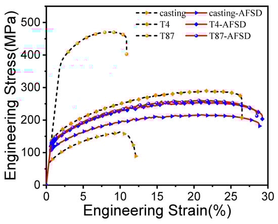 The engineering stress–strain curves for AA2219 alloy under different processing conditions.