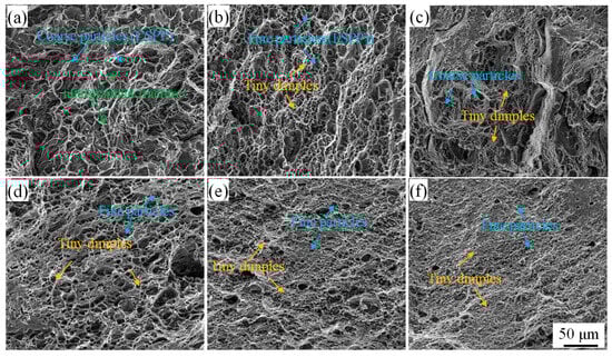 Fracture organization of AA2219 in different processing states: (a) casting; (b) T4; (c) T87; (d) casting-AFSD; (e) T4-AFSD; (f) T87-AFSD.