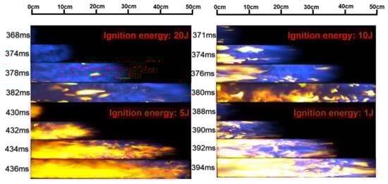 The change in flame morphology is ascribed to the combined effects of the pressure wave and flame propagation velocity changes [,]. Figure 3 illustrates the flame propagation images in an empty pipeline with different ignition energies, i.e., 20 J, 10 J, 5 J, and 1 J. These flame structures exhibit some differences, but also have certain similarities when the flame passes through the visual window. When the flame front appears in the visual window, the flame structure is relatively regular, but there is no obvious contour structure. The reflection of turbulence causes the flame structure to be irregular and oscillated while propagating in the middle of the visual window, and the flame front is stretched into a wave or jagged shape []. Figure 3 points out that the flame propagation velocity is affected by the ignition energy.