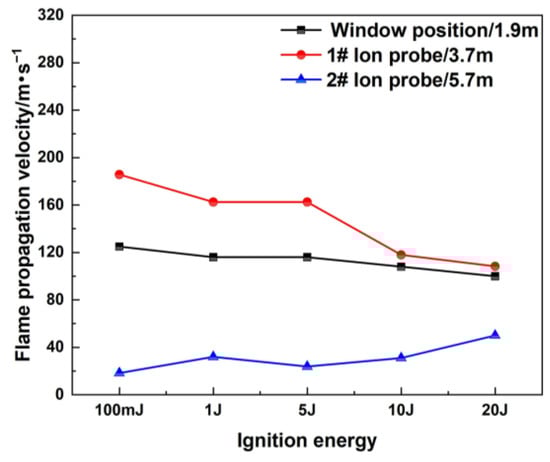 Figure 4 shows the flame propagation velocities under different positions and different ignition energies. The flame propagation velocity is the average value between the visual window and the ion probe, and between each ion probe. Under the same ignition conditions, the flame propagation velocity along the horizontal direction shows an initial increased tendency and then decreases [,]. Taking the flame propagation process of 100 mJ ignition energy as an example, the flame front moves slowly at the initial explosion stage. It takes 375 ms for the flame propagation to reach the position of the visible window, and the flame propagation velocity is 125 m/s at the visual window. As the explosion develops along the horizontal direction of the pipeline, the movement velocity of the flame front gradually accelerates, and the velocity is 185.7 m/s when the flame front reaches the position of the 1# ion probe. When the flame front approaches the closed end of the pipe, a reverse flow is generated and the propagation velocity decreases, and accordingly, the effect of heat loss increases, which further decreases the propagation velocity. The flame propagation velocity is 18.3 m/s at the 2# ion probe position. For different ignition energy conditions, it can be observed that the flame propagation velocity has a smaller range in the case of a higher ignition energy [].