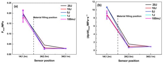 Maximum explosion overpressure and maximum rise rate of explosion overpressure under different ignition energy conditions (filling position: 1.8 m): (a) Pmax; (b) (dp/dt) max.