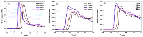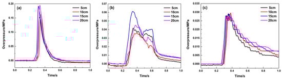 Explosion overpressure under different filling lengths (filling position: 4.3 m): (a) 1# pressure sensor; (b) 2# pressure sensor; (c) 3# pressure sensor.