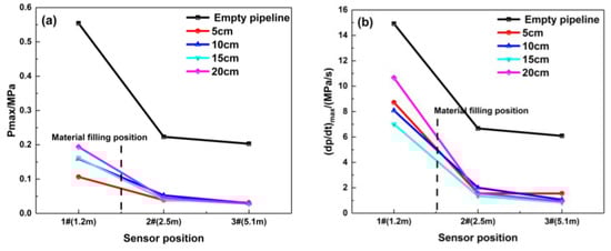 Maximum explosion overpressure and maximum rise rate of explosion overpressure under different filling lengths (filling position: 1.8 m): (a) Pmax; (b) (dp/dt) max.