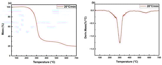 To further explore the thermal stability of the polyurethane foam, a thermogravimetric test was conducted on the sample in an air atmosphere with a heating rate of 20 °C/min. Figure 12 illustrates the thermogravimetric analysis (TGA) and differential thermogravimetric (DTG) curves of the polyurethane foam. The relative thermal stability of the sample is evaluated based on typical decomposition temperatures. According to the analysis of the TGA curve (Figure 12a), the polyurethane decomposition process can be divided into two stages. During the initial decomposition stage (240–400 °C), the polybasic alcohols in the sample undergo oxidation, resulting in the formation of CO, CO2, and H2O, which leads to a substantial mass loss of approximately 70%. In the second thermal decomposition stage (510–620 °C), the remaining chain segments within the sample continue decomposing, and there is a decline in the mass loss rate, where the polyurethane foam loses about only 10 wt% [,]. This experiment shows that the polyurethane foam in this work has considerable thermal stability.
