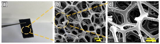 (a) Digital photos and (b,c) SEM images of polyurethane foam.