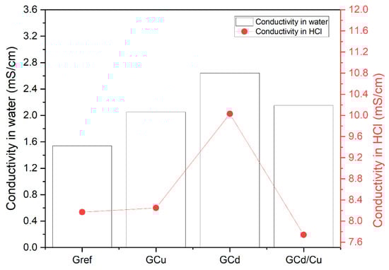 It can be observed in Figure 2 that, independently of the leaching media, the conductivity of the leachate from GCd is highest, followed by GCd/Cu > GCu > Gref. The conductivity indicates the mobility of different ions contained in the solution and can be correlated with the total dissolved ions available in the leachate [29]. So, the higher the conductivity, the higher the content of ions in the solution. This confirms the statement on the high solubility of the cadmium salt as discussed earlier, which increased the conductivity of the resulting leachate. Moreover, the conductivity of the leachate obtained in an acidic medium is higher than the one in water. This result agrees with the data reported in Table 2, which shows a higher concentration of ions in acid solution than in water.