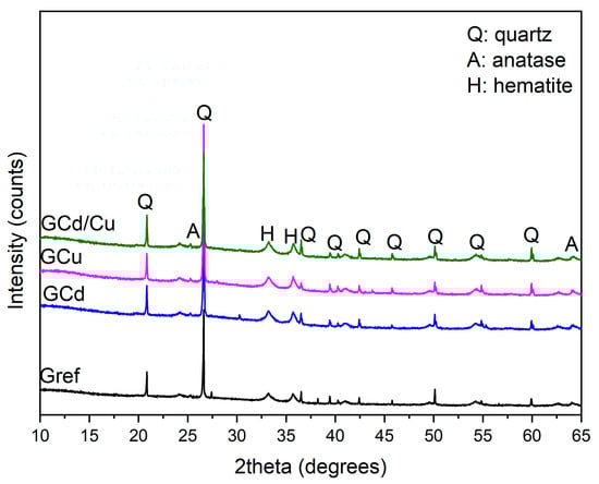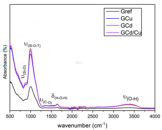 The XRD pattern of the reference geopolymer and the contaminated ones are presented in Figure 3. There are three major phases in all geopolymers, including hematite, quartz, and anatase. All the minerals present in Gref are still observed in the contaminated geopolymers. This infers that the heavy metals do not affect the mineralogy of the geopolymer and indicates that heavy metals are likely inserted in the amorphous geopolymer [28]. This also holds for the mineralogy after leaching in HCl and water (not shown here), where no considerable changes have been identified. The FT-IR spectra of the samples are depicted in Figure 4. The main change is observed in the band at around 1007 cm−1, corresponding to the stretching vibration of Si-O-T bonds (T = Si, Al, Fe), characteristic of the geopolymer binder. As observed, the intensity of that band is high in the contaminated geopolymers as compared to the reference geopolymer. This may be taken as being indicative of the effect of the heavy metal ions on the structure of the geopolymer network [27]. This change is more prominent in the spectrum of GCd than in GCu and GCd/GCu. This implies that the incorporation of cadmium affects the geopolymer structure significantly more than copper [30]. The absorption bands appearing at 3519 cm−1 and 1660 cm−1 are related to the stretching vibration of the O-H bond and the bending vibration of the H-O-H bond from water, respectively. The high intensity of the band at 3519 cm−1 in the contaminated geopolymers can also be an indication of the presence of the precipitated cadmium hydroxide and copper hydroxide since they are likely to be formed in the present system, as reported in previous work [31]. The band at 1371 cm−1 corresponds to the asymmetric stretching vibration of the C-O bonds of CO32− due to atmospheric carbonation on the geopolymer sample.
