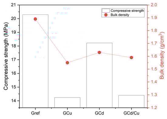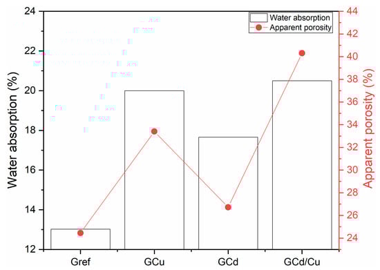 The compressive strength and bulk density of geopolymer samples are presented in Figure 5. The values obtained for compressive strength are 20.3, 14.3, 18.5, and 14.5 Mpa for Gref, GCu, GCd, and GCd/C, respectively. It is observed that the addition of Cd and Cu decreased the 28-day compressive strength. The same observation is performed for the bulk densities, where the values are: 1.9, 1.55, 1.63, and 1.6 g/cm3. This indicates that the heavy metals were integrated with the geopolymer network and created structural defects that led to a strength decrease. However, for Cd-contaminated geopolymer, the decrease observed is most likely related to the type of salt added. Since a report demonstrated that the addition of other salts, such as Cd(NO3)2, did not change the compressive strength [27]. Further, it was demonstrated that the strength decrease in CdCl2 might be attributed to the effects of the chloride contamination of the geopolymerization [32]. The highest strength decreases observed with Cu-contaminated geopolymer can be due to the way copper salt interacts during geopolymerization. Early in this work, it was reported that the heavy metal stabilization in this matrix also involves their precipitation as metal–hydroxide. The decrease of alkalinity due to the precipitation reaction likely hinders the dissolution rate of Si, Fe, and Al. Consequently, this slows down the growth of the geopolymer network skeleton, which reduces the compressive strength of the geopolymer [33]. This has also been emphasized in recent work, where it was demonstrated that the addition of ZnO during the synthesis of metakaolin-based geopolymer hinders the reaction and limits strength development [34]. The effect of these heavy metals on compressive strength can also be correlated with the trend of bulk density, which evolves Gref > GCd > GCu/Cu. The apparent porosity and water absorption presented in Figure 6 also agree with the evolution of compressive strength. In fact, the addition of heavy metals increased both the apparent porosity and the water absorption. The results yield 24, 34, 17, and 41% of porosity for Gref, GCu, GCd, and GCd/C, respectively, with water absorption of 12.5, 19.5, 17.5, and 20%.