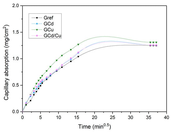 To explain the potential of a monolith geopolymer to resist leaching out of the stabilized heavy metals, the water penetration through a capillary pore has been carried out and reported in Figure 7. It can be observed that the curve is characterized by two trends, with the first one consisting of fast water penetration, while the second phase is steadily and mainly governed by the entrapped air diffusing out after the water saturation is reached. However, for all the samples, the water penetration rate is lower (0.1356, 0.1683, 0.1923, and 0.1872 mg/cm2·min0.5 for Gref, GCd, GCu, and GCd/Cu, respectively). This means that when exposed to an aggressive environment liable to leach out the stabilized contaminant, this process will happen very slowly over time. The tendency of the rate of water penetration observed among the reference and contaminated geopolymers agrees with the evolution of the porosity.
