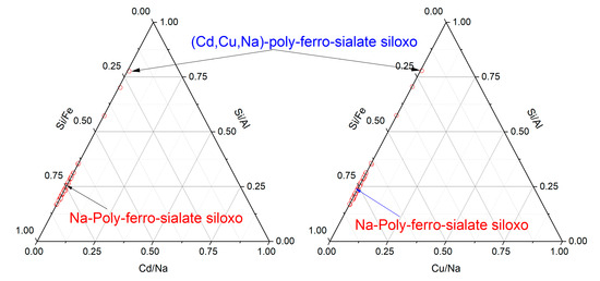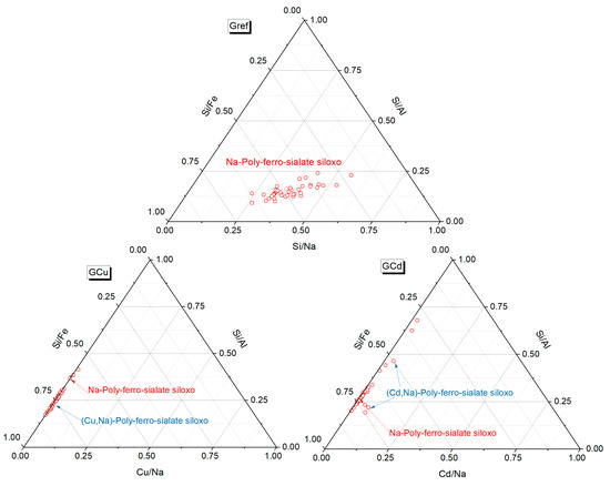 The microstructure of samples Gref, GCd, and GCu and the representation of the different elements in the samples are highlighted in Figure 8 and Figure 9. The reference geopolymer shows a dense microstructure with shapeless phases. When heavy metals are added, the microcracks are more represented, which somehow explains the compressive strength decrease and porosity increase, as discussed earlier. The literature stated that the presence of more cracks with the addition of heavy metals in the structure of geopolymer can explain the effective solidification/stabilization of those heavy metals in the matrix [35]. The mapping of the distribution of all the elements present has been used to identify the behavior of heavy metals and to distinguish different features in the microstructure. In Figure 8, the brightest features of silicon and iron maps are identified as the non-reacted particles of quartz (Q) and hematite (H), respectively, whereas the non-bright area contains a homogeneous distribution of all the elements and corresponds to the binder. They have an average Si/Al atomic ratio < 2 and Si/Fe ranging from 2 to 7, which corresponds with Na-poly-ferro-sialate siloxo binder [25]. The microstructure and elemental maps of the contaminated geopolymers are shown in Figure 9. It is observed that Cu is uniformly distributed in all the areas of different samples constituting the binder. The microstructure also shows unreacted phases (hematite and quartz) along with cadmium, which appears as a bright part of the mapping. The presence of both metals simultaneously does not show any specific changes in their distribution within the binder, as observed in Figure 10. The presence of heavy metals in the binder shows that they have chemically reacted during geopolymerization. The analysis of the EDX composition of more than 40 spots through each contaminated geopolymer helped to identify the chemical composition of the binder and the changes brought by the addition of the heavy metals. Figure 11 and Figure 12 show that the composition of the reacted phases (binders) is modified by the presence of heavy metals. Initially, the main composition identified is Na-poly-ferro-sialate siloxo, which is present in all mixes and consists of the reaction of the iron-rich laterite with sodium silicate. This nomenclature means that the basic unit of the polymer is composed of iron, alumina, silica, and sodium. When Cu and Cd are added, either separately or simultaneously, the new binder chemistry is composed of (Cu,Na)-poly-ferro-sialate siloxo, (Cd,Na)-poly-ferro-sialate siloxo, and (Cu,Cd,Na)-poly-ferro-sialate siloxo, respectively. This indicates that Cu and Cd have chemically reacted during geopolymerization through the ion exchange process with sodium, which ascertains the stabilization mechanism stated earlier in this section.
