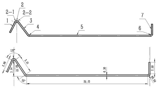 Partitioning and dimensions of the individual parts of the strip with a specific asymmetric cross section formed in the cold roll forming process. 1—partition 1, 2—partition 2 (Includes partitions 2-1 and 2-2), 3—partition 3, 4—partition 4, 5—partition 5, 6—partition 6, 7—partition 7.