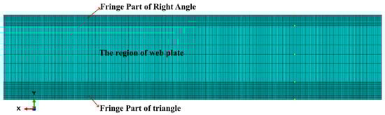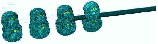 The strip cold roll forming process was modeled using ABAQUS as follows. In the cold roll forming process by means of four sets of forming rolls, the first set of rollers are prepress rollers with no significant deformation, so the model is built by biting into the strip directly from the second set of rollers adopting the ABAQUS/Explicit dynamic analysis model. A deformable body cell of cell type C3D8R (eight-node linear hexahedral cell, reduced integration, hourglass control) is used for the strip to accurately reflect the deformation process in each part of the strip. Hourglass control mode adopts stiffness hourglass control, because for plastic bending problems, better calculation results can be obtained by using stiffness-based hourglass control. Meanwhile, a reasonable mesh refinement is applied to the strip model. The artificial strain energy (ALLAE) of the strip after forming is found to be not more than 1.5% of the internal energy for the whole model (ALLIE) in numerical simulation, which indicates that the hourglass is controllable and the calculation results in this mode are accurate. The roller sets are set as discrete rigid bodies with unit-type C3D10M (ten-node modified quadratic tetrahedral unit). Construct the model using SolidWorks and import it to ABAQUS. The beveled section of the rollers is stitched to aid in the meshing of the roller sets. To investigate the impact of the roll gap, the roll gap was adjusted to 0.3 mm, 0.4 mm and 0.5 mm, respectively. The roller sets are equally spaced and modeled with roll spacing of 100 mm/120 mm/140 mm, respectively. Four sets of rollers (eight rollers) are rigidly fixed and the relative speed of the upper and lower rollers is 5 r/s. In the interaction module, the generic contact algorithm is selected. The contact properties of the interaction are set for normal behavior and tangential behavior. The friction formula for tangential behavior is the penalty formula, which is applicable to most metal forming problems, the generic coulomb friction is selected, and the friction coefficient is set to 0.2. The pressure overclosure is set to hard contact for normal behavior, and the constraint enforcement is set to default mode. The length of raw strip is 800 mm. To precisely depict the distortion of the flange section in the strip’s cross section, the mesh of the flange fragment requires refinement for mesh sizes between 0.15 mm and 0.375 mm. The deformation in the central section is minimal and the mesh is coarser, with a size of 3.9 mm. The meshed cold roll forming model of the strip is illustrated in Figure 5. The subdivided strip mesh is shown schematically in Figure 6.