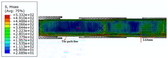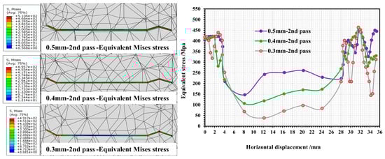 When the roll gap was 0.4 mm, the changes in longitudinal stress and strain in the strip after the second, third and fourth forming passes during the strip forming process were investigated when the strip flange triangular part is 2.64 mm away from the outer edge, and the roll spacing is 100 mm, 120 mm and 140 mm, respectively. The established paths are shown in Figure 14, together with the stress and strain distributions along the paths shown in Figure 15 and Figure 16. In addition, strip edge wave fluctuation diagrams at the edge of the flange triangular part (i.e., at 0 mm) were also determined, as shown in Figure 17.