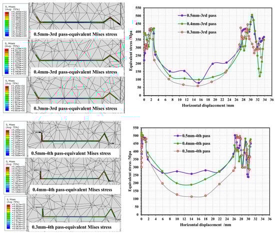 Stress variation in strip cross section at 2nd/3rd/4th pass with different roll gaps.