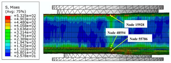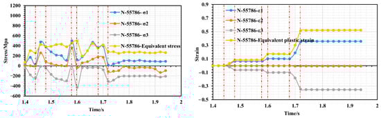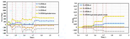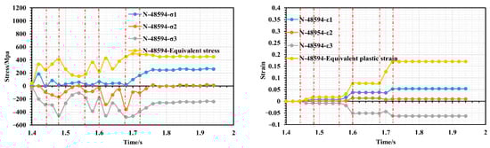 Taking the example of a roll gap of 0.4 mm, we selected the nodes with significant features, namely, 55786, 48594, and 15928, from the fourth forming roll located near corners 2, 4 and 6 to examine the changes in stress–strain history. Figure 9 shows a schematic diagram of the location of the selected characteristic nodes, Figure 10 shows the variation in stress–strain history of node 55786 (the top of corner 2), Figure 11 shows the variation in stress–strain history of node 48594 (inner side edge of corner 4 at the bottom of the flange triangular region), and Figure 12 shows the variation in stress–strain history of node 15928 (inner side edge of corner 6 at the flange right-angled region).