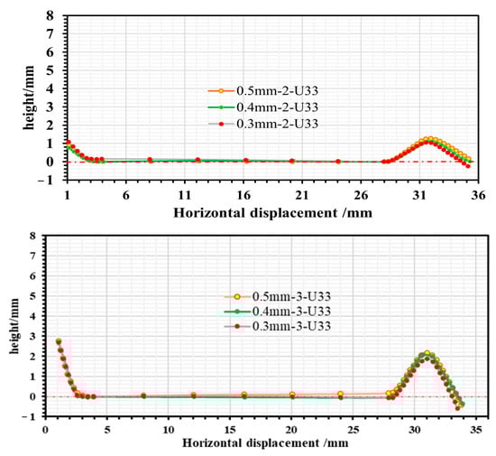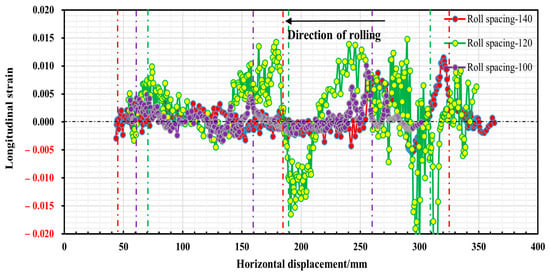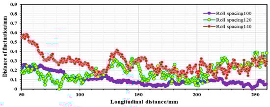 It is evident from Figure 15 that the longitudinal stresses within the strip during the forming process are predominantly tensile stresses. However, a fleeting longitudinal compressive stress is observed when the strip departs from the roll group in the third pass. With an increase in roll spacing, there is a slight incremental trend observed in the peak stress of the strip while passing through each roller. The peak stress measures around 380 Mpa, suggesting that the longitudinal stress of the strip is predominantly elastic stress. It can be seen from Figure 16 that the peak longitudinal strain at different roll spacings shows a decreasing trend as the number of passes increases. However, the longitudinal strain fluctuation is greatest when the roll spacing is 120 mm. As the number of passes increases, especially after the fourth pass, the longitudinal strain value for a roll spacing of 140 mm (peak strain of 0.002) is smaller than the longitudinal strain value for a roll spacing of 100 mm (peak strain of 0.004). It is shown that when the roll spacing is sufficiently large, it is possible to effectively reduce longitudinal strain. However, as roll spacing increases, it also leads to greater longitudinal stress, and this increase can result in strip rebound and exacerbate the strip’s fluctuation phenomenon, ultimately aggravating the edge wave phenomenon of the strip. Figure 17 illustrates the strip fluctuation of the edge wave at the edge of the flange triangular part t (i.e., at 0 mm). As observed, the edge wave phenomenon of the strip becomes more serious with an increase in roll spacing. At a roll spacing of 140 mm, the edge wave fluctuates between 0–0.5 mm, at 120 mm, it fluctuates between 0–0.35 mm, and at 100 mm, the edge wave of the strip is at its smallest, with a fluctuation of 0–0.26 mm. Furthermore, augmenting the roll spacing will result in increased volume of the forming roll set equipment and manufacturing costs. Taking into account multiple factors, the roll spacing of 100 mm appears to be the most suitable option.