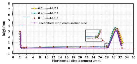 From Figure 13, it can be seen that the roll gap has little effect on the deformed dimensions of the right-angled part of the flange of the strip asymmetric cross section, but it has a significant effect on the triangular part of the flange. As the roll gap decreases, the triangular part approaches the desired size. However, as the number of forming passes increases, the cumulative strain of the triangular part becomes greater than that of the right-angled part. This results in deformation phenomena such as warping of the triangular part under stress after forming. When the roll gap is 0.3 mm, it becomes comparable to the thickness of the strip due to the rebound of the bent corner regions, which results in an excessive squeezing of the triangular part during the fourth pass forming. The result is an excessive elongation of the flange triangular region of the strip and a concave phenomenon in corner 4 connecting the flange triangular region and the web plate. The thinning phenomenon occurs in this region, indicating that the strain in this location ought to be greater, which can be verified from Figure 8. Therefore, taking into account factors such as the stress–strain of the strip cross section and the accuracy of the strip dimensions, the roll gap of 0.4 mm is relatively good.