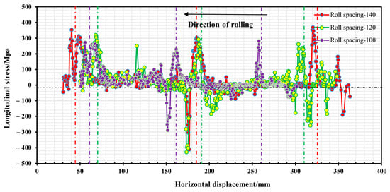 - As the roll spacing increases, the peak longitudinal stress of the strip passing through each roller group shows a small incremental trend, but the peak stress is around 380 MPa. When the roll spacing is large enough, it can effectively reduce the longitudinal strain, but it will lead to an increase in the longitudinal stress, which easily leads to the rebound of the strip and aggravate the phenomenon of strip edge wave. Combined with the fluctuation in strip edge at different roll spacings and factors such as manufacturing cost and volume, a roll spacing of 100 mm is appropriate.