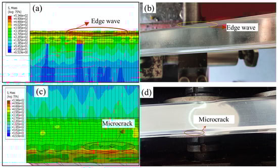 Simulation and experimental diagrams of the phenomenon of edge wave and tearing at the top of corner 2 during strip forming. (a) Edge wave phenomenon in simulation… (b) Edge wave phenomenon during strip forming (c) Tearing at the top of corner 2 in simulation (d) Tearing at the top of corner 2 during strip forming.