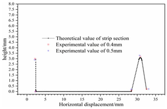 During the simulation, the two main types of defects that appeared during strip forming were edge waves and intermittent crack lines that appeared at the top of corner 2, as shown in Figure 19. This was also verified in subsequent experiments. The appearance of these two types of defects is mainly due to the roll gap being too small, so that the strip in the passing roller groups surge in strain, and ultimately lead to defects; the above defects are generated in the roll gap of 0.3 mm when appearing. When the roller gap was increased to 0.35 mm, the experiment showed that the strip edge wave phenomenon almost disappeared, but there were still microcracks at the top of corner 2. When the roll gap increased to 0.4 mm, the surface quality of the strip was good, and the physical object of the strip formed in each pass is shown in Figure 20. By measuring the cross-sectional size of the strip, it was found that the test data of the strip cross section were in good agreement with the theoretical value. Comparison of experimental and theoretical values of strip cross-section dimensions is shown in Figure 21. When the roll gap was increased to 0.5 mm, the dimensions of the strip cross section were found to be slightly larger than the theoretical values, and the experimental values and simulation results showed consistency. This indicates that when the roll gap is large, the strain concentration phenomenon is effectively alleviated and defects such that cracks do not occur, but it has a greater effect on the forming accuracy of the strip cross section.