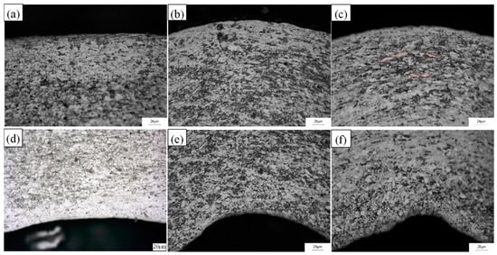 Microstructure variation of the inside and outside part of corner 2 for each pass at a roll gap of 0.4 mm. (a) Outside of corner 2 of pass 2. (b) Outside of corner 2 of pass 3. (c) Outside of corner 2 of pass 4. (d) Inside of corner 2 of pass 2. (e) Inside of corner 2 of pass 3. (f) Inside of corner 2 of pass 4.