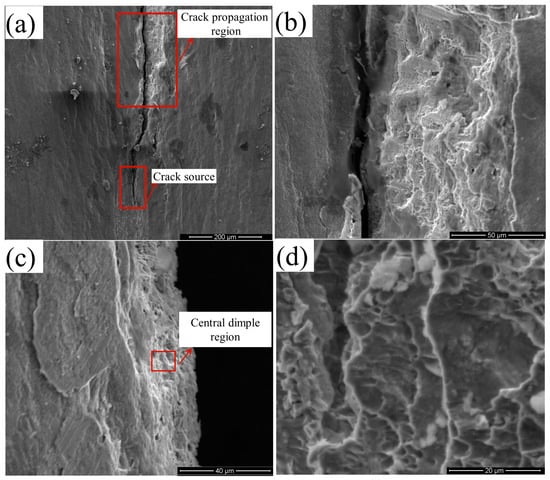 Morphological view of crack propagation at the top of corner 2. (a) Macroscopic morphology of crack source and crack extension region. (b) Enlarged view of the crack extension region. (c) Typical tough nest morphology of the mid-region (d) Enlarged view of the typical tough nest morphology.