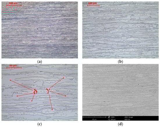 Microstructure of base material LDX 2101 steel in the as-delivery state. LM-BF (a–c) and SEM-BSE (d).