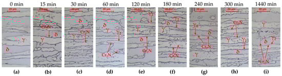 The tested steel was characterized by a banded microstructure characteristic of products shaped by rolling (Figure 1a). A typical microstructure of the γ phase (austenite) distributed in the matrix of the δ phase (δ-ferrite) was observed. An analogous structure after hot rolling of lean duplex LDX2101 steel was observed by G. Ubertalli et al. [], F. Iacoviello et al. [], W. Gong et al. [], F. Tehovnik [] or S. Gudikandula, and A. Sharma []. Changes in the microstructure after annealing at 800 °C are shown in Figure 2. The phase equilibrium diagram for LDX2101 steel [] indicates that at this temperature, chromium nitrides Cr2N and trace amounts of M23C6 carbide may also be present in equilibrium with austenite and ferrite. The appearance of precipitates is observed after 15 min of annealing (Figure 2b). This means that even a short time of holding at a temperature of 800 °C will predispose the release of chromium nitrides at the δ/γ interface. After annealing for 60 min, clear effects of the decomposition of δ-ferrite into austenite and the precipitation of nitrides and/or carbides at the δ/γ interface are already observed in accordance with the following reaction: