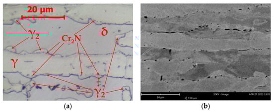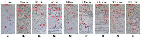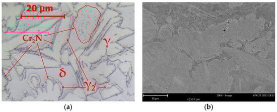 After 1440 h of annealing, a δ-ferritic–austenitic microstructure is observed (Figure 6, Table 4). Chromium nitrides, Cr2N, precipitate in the δ-ferrite and at the δ/γ interface boundary, which has become the γ/Cr2N/γ2/δ boundary due to the disintegration of δ-ferrite.