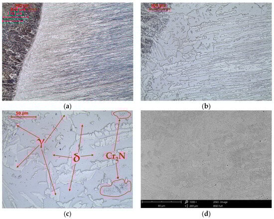 The microstructure of the heat-affected zone is divided into high-temperature and low-temperature heat-affected zones, which differ in grain size and the degree of defragmentation of the band-arranged austenite (Figure 4). The observed higher content of ferrite compared to austenite in the high-temperature heat-affected zone in the as-welded state results from the relatively high cooling rate, which is due to the input of a small amount of heat into the layer (Table 2). The welding process heats the material, creating a temperature gradient from the solidus temperature near the fusion line to the initial temperature in the area away from the fusion line. Heating the high-temperature heat-affected zone above the solvus line leads to the complete transformation of austenite into δ-ferrite. Once the heat source is removed, cooling begins. The faster the cooling rate, the more it inhibits the transformation of δ-ferrite into austenite and the greater the volume fraction of δ-ferrite after cooling to an ambient temperature. The so-called “bee swarms”, which are chromium nitrides, Cr2N, isolated as a result of rapid cooling from the existence of δ-ferrite. The solubility of nitrogen in δ-ferrite is high at high temperatures but decreases as the temperature decreases. As a result, they are released in the steel structure in the heat-affected zone after cooling.
