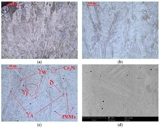 Microstructure of E2209 weld metal in the as-welded state. LM-BF (a–c) and SEM-BSE (d).