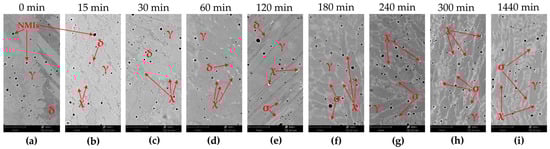 This reaction is also confirmed by a constant decrease in the content of the magnetic phase in the weld (Figure 10) due to the fact that austenite (γA, γW, γI, and γ2), slag (NMI), and intermetallic phases (χ, σ) are non-magnetic. Annealing carried out on 2906 super duplex steel with molybdenum (2%) and nitrogen (0.38%) at a temperature of 800 °C showed that the share of intermetallic phases after 27 min of annealing increased from 0% to 9.2%, after 81 min of annealing it increased to 28.0%, and after 72 h to 37.5% []. The kinetics of phase separation, taking into account the differences in chemical composition and material condition (rolled material vs. weld) seems to correspond to that observed in grade 2209 (Figure 10). For welds of grade 2209, Kang et al. [] showed that, after annealing at 800 °C and 850 °C for 30 min, the σ phase and small amounts of the χ phase and chromium nitrides Cr2N are present in the microstructure. The amount of magnetic phase at 850 °C, expressed by the ferrite number, was 1.9 FN (which approximately corresponds to the percentage of ferrite []). Therefore, a level was achieved that was very similar to that obtained in the research (Figure 10). Also, Antunes et al. [] showed that after annealing of grade 2209 welds at a temperature of 700 °C for 50 and 100 h (3000 and 6000 min), γ austenite and χ and σ phases appear in the microstructure. No δ ferrite was found. However, it should be noted that the annealing time is much longer (over twice and over four times) than the maximum time in this experiment (1440 min). Additionally, the sequence of release of intermetallic phases at a temperature of 800 °C, suggested by Escriba et al. [], was not confirmed, i.e., the release of the χ phase was preceded by the σ phase.