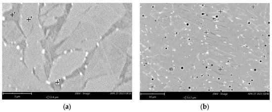 The effect of heat treatment at a temperature of 800 °C on the microstructure is shown in Figure 8. After 15 min of annealing, bright single very small precipitates appear on the δ/γ interfaces. These precipitates are characterized by a high content of Cr (approximately 25% by weight) and Mo (approximately 14% by weight) and are probably the χ phase (Figure 9a, Table 6). The number of precipitates increases as the annealing time increases, up to 60 min. After 120 min of annealing, larger and slightly darker precipitates appear on the δ/γ interfaces compared to the χ phase precipitates. These precipitates contain a larger amount of Cr (approximately 31% by weight) and a smaller amount of Mo (approximately 7.5%) than the χ phase precipitates (Figure 9b, Table 6). This is probably the σ phase. With increasing time, there is an increase in the content of the σ phase and decreases in the content of the χ phase and δ-ferrite are observed. However, after 24 h of annealing, only austenite and the σ phase are observed in the microstructure.