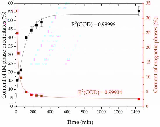An asymptotic curve with Equation (2) was fitted to the results of the dependence of the amount of intermetallic phase precipitates on the annealing time at a temperature of 800 °C using orthogonal distance regression. In this way, a fit of R2 (COD) of 0.99996 was obtained. The rational curve from Equation (3) was fitted to the results of the dependence of the amount of magnetic phase on the annealing time at 800 °C using orthogonal distance regression. In this way, a fit of R2 (COD) of 0.99934 was obtained. Detailed data are presented in Table 7.