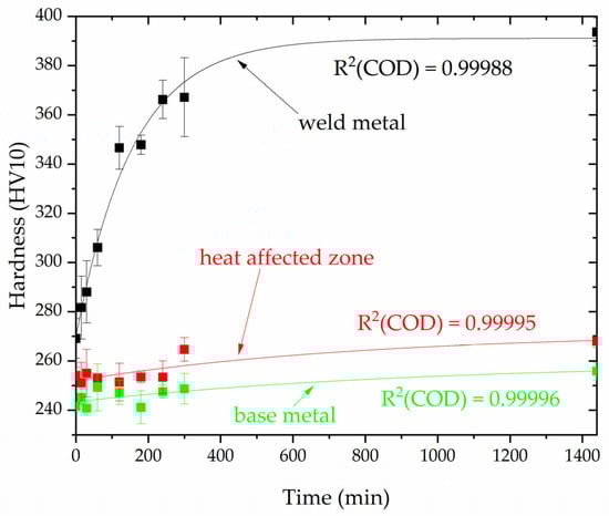 Hardness measurements (Figure 11) confirmed the observed trend of changes in microscopic and magnetic examinations. The hardness measurements showed a significant increase in weld metal hardness with an increasing annealing time at 800 °C. The asymptotic hardness increase demonstrates a steady rise after a short period of annealing. After 60 min, the hardness increased by an average of 37 HV10 and, after another 60 min, it increased by an average of 40 HV10. The subsequent increase in hardness was not as rapid, amounting to no more than 20 HV10 for the following 180 min and the next 1140 min. The asymptotic curve fitted using orthogonal distance regression is characterized by an R2 (COD) fit of 0.99988 and the parameters of Equation (2) for this case are listed in Table 8.