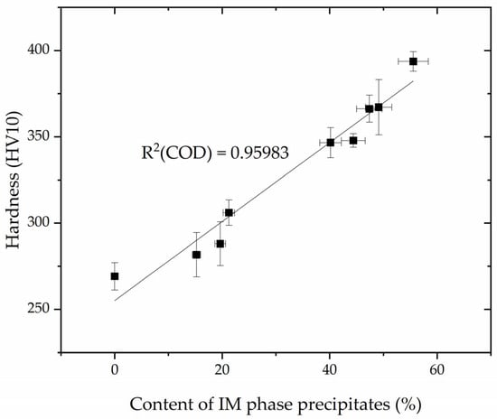 where a = 255.11523 ± 6.57159 and b = 2.28943 ± 0.17703 has a relatively high correlation coefficient R2(COD) = 0.95983. It is possible to indirectly assess the proportion of intermetallic phases after heat treatment at 800 °C based on hardness measurements.