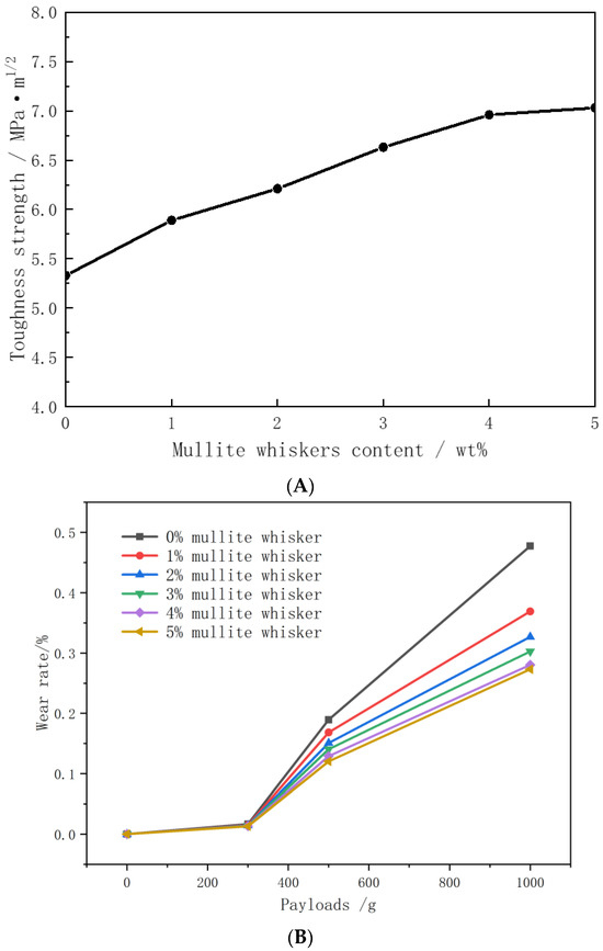 Mullite whiskers were added to ceramics at 1%, 2%, 3%, 4%, and 5%, and the strengths of the toughened ceramics were tested using a universal testing machine. As shown in Figure 12, the trend graphs of the toughness strength and wear rate of ceramics with different mullite whisker additions were compared. The results show that the toughness strength and wear rate of ceramics increased with the increase in mullite whisker addition. However, with the increase in mullite whisker addition, the toughening amplitude of the toughness strength and wear rate of ceramics gradually decreased, especially when the mullite whisker addition was more than 3 wt. %, and the continued increase in mullite whisker content led to a limited enhancement in the wear resistance of ceramics. For example, at a load of 1000 g, the wear rate of the ceramic was reduced by 36.61% when the mullite whisker addition was increased from 0% to 3%, but the wear rate of the ceramic was reduced by 9.75% when the mullite whisker addition was increased from 3% to 5%. Combining the SEM images with mullite additions of 0 wt. % and 3 wt. %, it can be seen that with the addition of mullite whiskers, cracks often started to expand from defects or stress concentration points when external stresses were applied to the ceramics. However, the presence of mullite whiskers prevented the uncontrolled extension of cracks. The cracks were restrained around the whiskers and forced to change direction, which slowed down crack propagation and, thus, increased the toughness of the material. Considering the economic costs, the addition of 3 wt. % of mullite whiskers as a toughening base enhanced the toughness strength of the ceramics by 16.56% and reduced the wear rate to less than 0.4% compared to the addition of no mullite whiskers.
