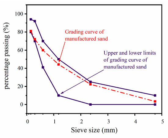 The particle gradation curves of the MS are shown in Figure 1. The aggregates were tested; the details are presented in Table 2. MS was provided by Changzhou Anfeng Technology Co., Ltd. (Changzhou, China). Except for the methylene blue value (MB), the MS properties met the requirements of the specification [30]. The RCA was provided by Jiangsu Wujin Green and was produced and provided by Lvhe Environmental Technology Co., Ltd. (Changzhou, China); its performance met the requirements [31].