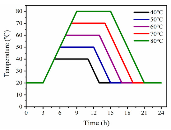 Of the six concretes, one group of concrete test blocks (three test blocks) was put in a standard curing room (20 ± 2 °C) for standard curing (numbered as 0). The other five groups of concrete were put into a ZKY-400 steam-curing box for steam-curing (40 °C, 50 °C, 60 °C, 70 °C, and 80 °C, numbered 1–5, respectively). The concrete surface was covered with a PVC film to reduce thermal damage from steam-curing. Steam-curing includes four stages: pre-curing, temperature increase, constant temperature, and temperature decrease. After the initial setting, the concrete was immediately placed in a steam-curing box, and the temperature was maintained at 20 °C for 3 h. Subsequently, the temperature was increased to 40 °C, 50 °C, 60 °C, 70 °C, or 80 °C at a heating rate of 10 °C/h [25,27]. The final temperature of the steam-curing box was maintained for 6 h. Ultimately, the temperature was reduced to 20 °C at a cooling rate of 10 °C/h. The concrete block was removed from the steam-curing box and demolded at room temperature. After demolding, the test blocks were immediately sent to the standard curing room. The steam-curing regime for the experiment is shown in Figure 2.