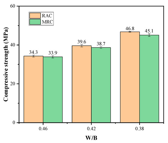 The 28 d compressive strengths of RAC and MRC with different W/B ratios in standard curing conditions are shown in Figure 3. The 28 d compressive strength of the RAC reached 110% of the design strength. Although the MS quality was poor, the 28 d compressive strength of the MRC reached the design value. With the same W/B, the compressive strength of MRC was slightly lower than that of RAC (the difference in strength between the two was not more than 5%). Most studies have shown that the rough surface and polygonal shape of MS are beneficial for improving the connection between the cementitious material and aggregate, increasing the compressive strength [15,16]. A few studies have shown that the compressive strength of MRC first increases and then decreases with an increase in low-mass MS [18]; however, it is not clear which specific index of the physical properties of MS causes the decrease in MRC compressive strength. Comparing the performance of the manufactured sand in this experiment with past experiments, it was found that the physical properties of the manufactured sand in this experiment, in addition to the MB value (the size of the MB value reflects the content of mud powder in the manufactured sand), and other MS properties were improved. However, the compressive strength of concrete still decreased, suggesting that a larger MB value may negatively impact the compressive strength of MRC containing 100% MS. The MB value of MS was 1.7, which indicates a relatively large proportion of mud powder in the fine powder of MS and a relatively small proportion of stone powder. Absorbed water results in a weakening of the cement bonding ability. This is the fundamental reason why the MRC strength was lower than that of the RAC. It was also found that the 28 d compressive strength of the MRC decreased more rapidly with a lower W/B. With the W/B ratio from 0.46 to 0.38, the compressive strength of the MRC decreased by 0.4 MPa, 0.9 MPa, and 1.7 MPa, respectively.
