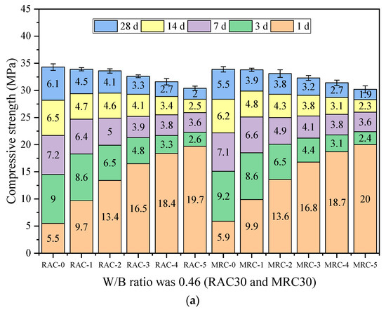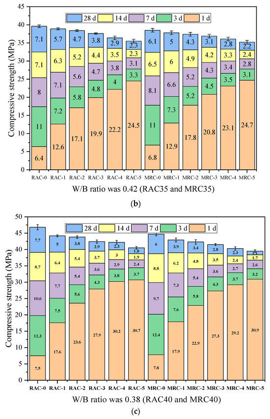 Figure 4 shows the development law of the compressive strength of concrete with three W/B ratios at different steam-curing temperatures. In the early stage, for both MRC and RAC, the compressive strength was significantly higher with steam-curing than with standard curing. At 1 d, the compressive strengths of MRC30 and MRC35 were slightly higher than those of RAC under the same conditions. However, at 28 d, the compressive strength of the MRC was slightly lower than that of the RAC under the same conditions.