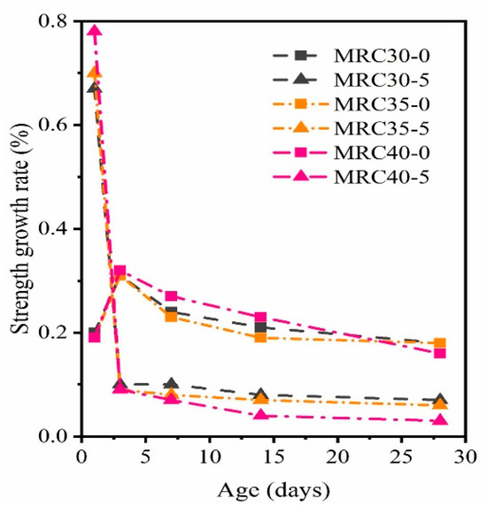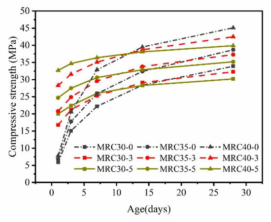 Taking MRC30 as an example, from 40 °C to 80 °C, the 1 d compressive strength gradually increased. The 1 d compressive strength obtained under steam-curing is 1.68, 2.31, 2.85, 3.17, and 3.39 times that under standard curing, and 66.67% of the design strength, respectively. At 60 °C and above, the 1 d compressive strength of MRC30 was sufficient to meet the demolding strength requirements of prefabricated components (prefabricated components require demolding strength to reach 50% of the design strength). At all steam-curing temperatures, the 7 d compressive strength of the MRC reached 75% of the design strength (prefabricated components require hoisting strength to reach 75% of the design strength). At this time, the concrete with standard curing did not reach 75% of the design strength; thus, it could not be hoisted. The compressive strength growth slowed significantly after 7 d. With standard curing, the 28 d compressive strength of MRC30 reached 113% of the design strength. With increasing curing temperature, the 28 d compressive strength of MRC30 gradually decreased. The compressive strength of the concrete at each steam-curing temperature reached 111.67%, 110.33%, 107.67%, 104.67%, and 100.67% of the design strength, respectively.
