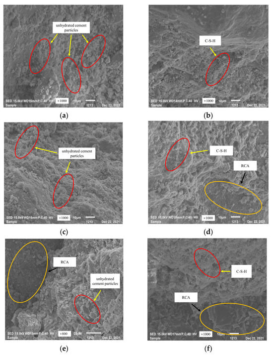 Figure 7 shows the 1 d hydration products of three W/B of MRC at standard curing temperature and 60 °C steam-curing temperature. In Figure 7a,c,e with standard curing, the unhydrated cement has more particles, a more dispersed floc structure distribution, and a smaller volume of floc structure. With steam-curing, in Figure 7b,d,f, MRC30 and MRC35 still have some unhydrated cement particles after 1 d of steam-curing at 60 °C but are not hydrated. The cement particle content decreased significantly, and the volume of the flocculent structure increased. This indicates that the improvement in early strength of low W/B ratio concrete (MRC30 and MRC35) with steam-curing at 60 °C is mainly due to the increase in the volume of hydration products. Figure 7f shows the hydration product of MRC40 with 60 °C steam-curing for 1 d. Figure 7a shows that MRC40 still has unhydrated cement particles after 1 d of steam-curing at 60 °C, but compared with the concrete with standard curing, the hydration reaction rate is increased owing to the increase in curing temperature. The hydration products are a large number of floc structure crystals (CSH) in the concrete; they are intertwined and are an important support for the strength of the concrete. This indicates that the improvement in the early strength of MRC40 concrete with 60 °C steam-curing is due to the increased volume of hydration products and to the change in the morphology of the hydration products.
