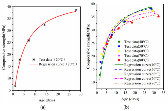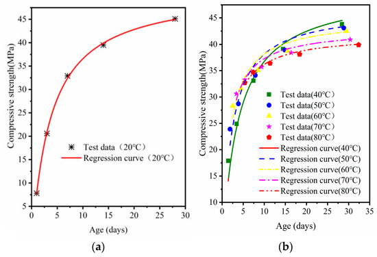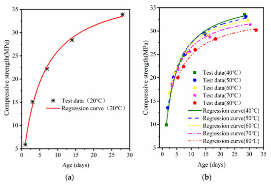 Equation (2) was used to fit the compressive strength of MRC at standard curing, 40 °C, 50 °C, 60 °C, 70 °C, and 80 °C curing versus age. The fitted curves are shown in Figure 8, Figure 9 and Figure 10; the regression parameters are presented in Table 5.